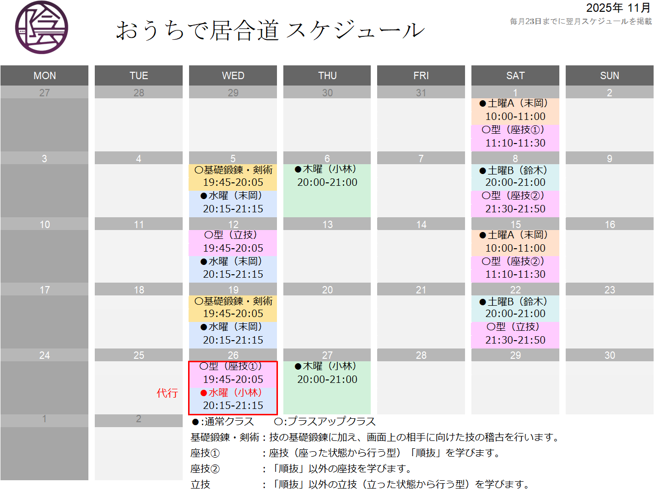 ※11月26日の水曜クラス及びプラスアップクラスは小林講師の代行となります。予めご了承ください。